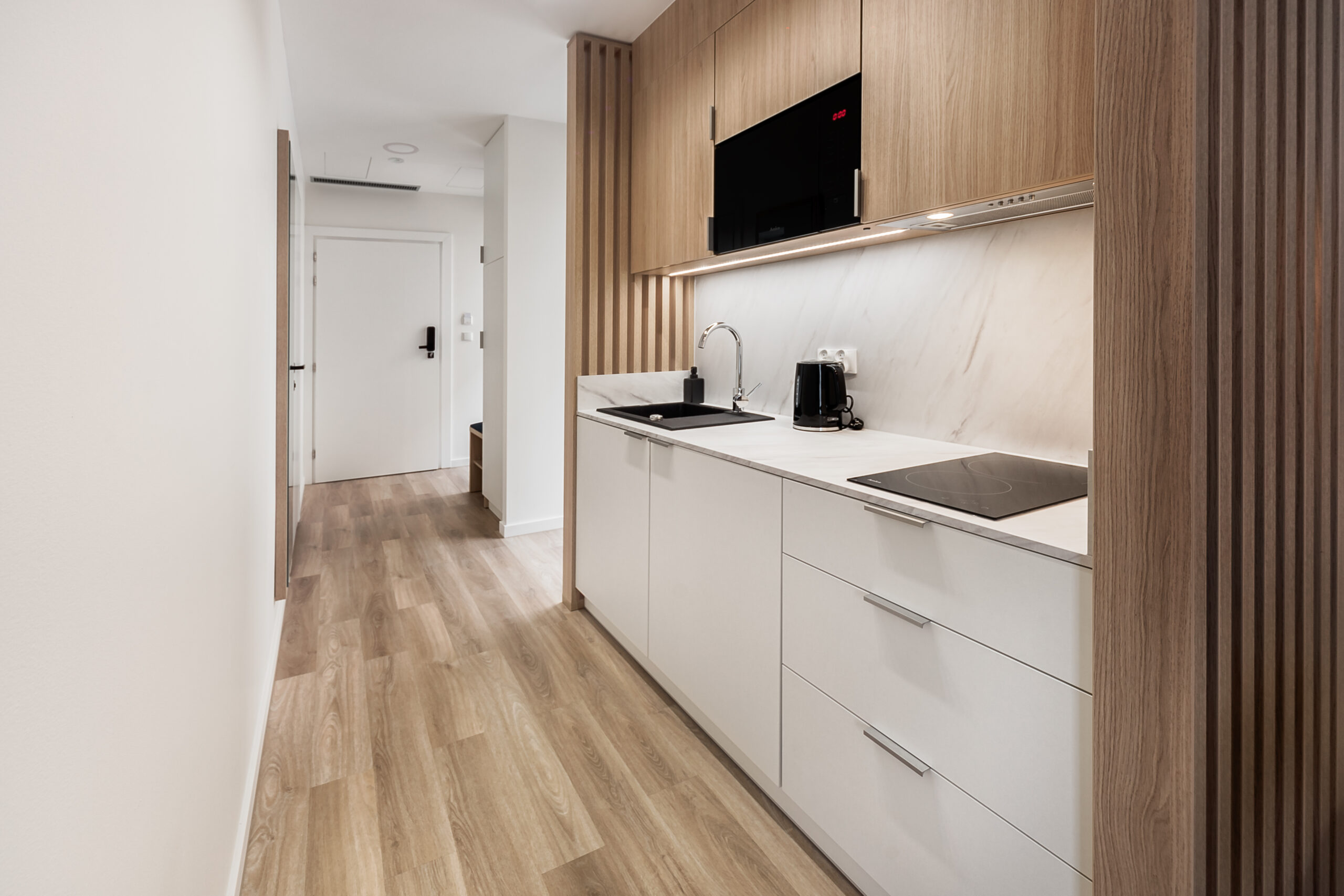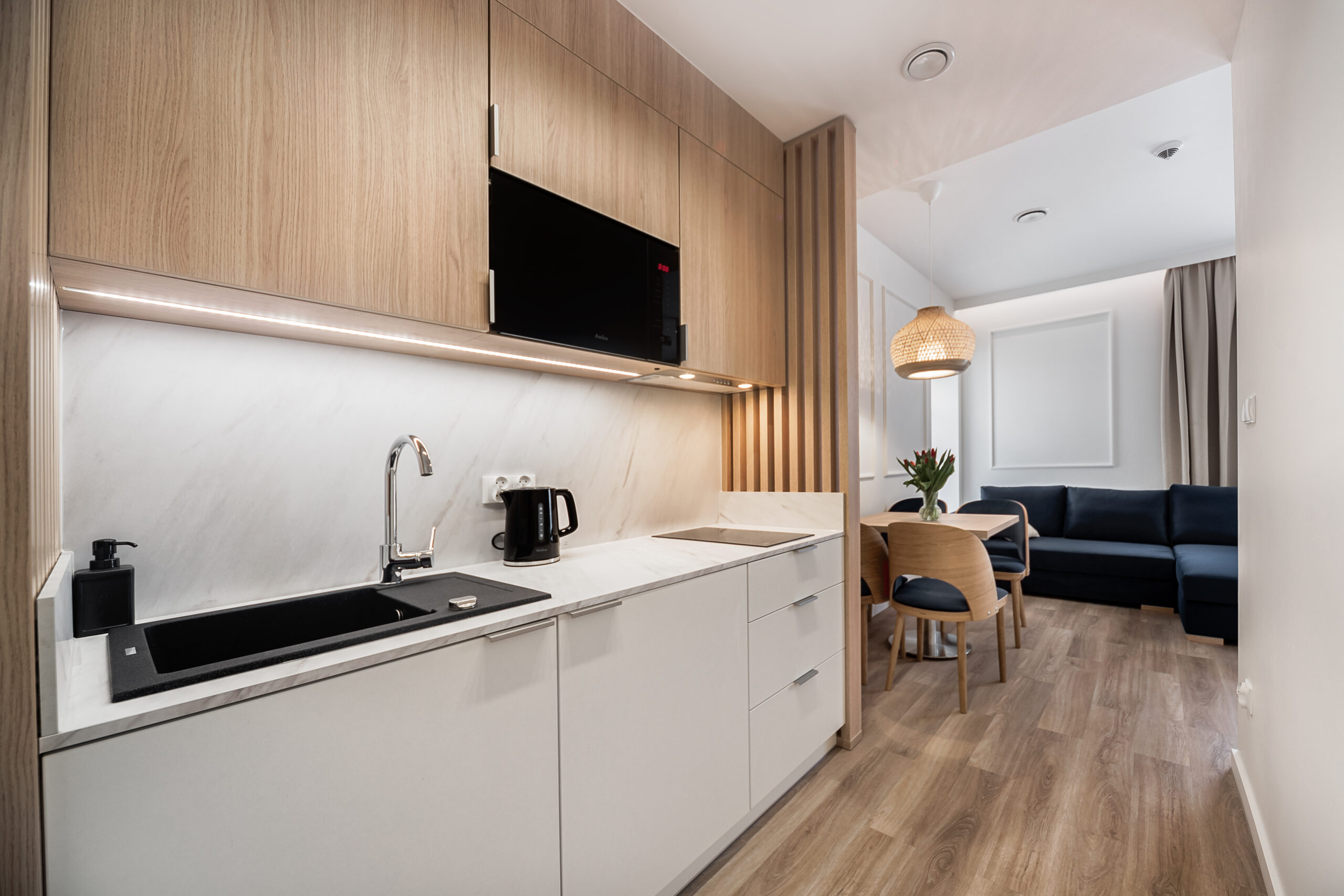Aneks kuchenny posiada: dwupalnikową płytę indukcyjną, kuchenkę mikrofalową, mini-lodówkę, zlew, czajnik elektryczny, zestaw garnków, talerzy, szklanek i sztućców. Łazienka wyposażona jest w umywalkę, lustro, kabinę prysznicową, WC, suszarkę do włosów.