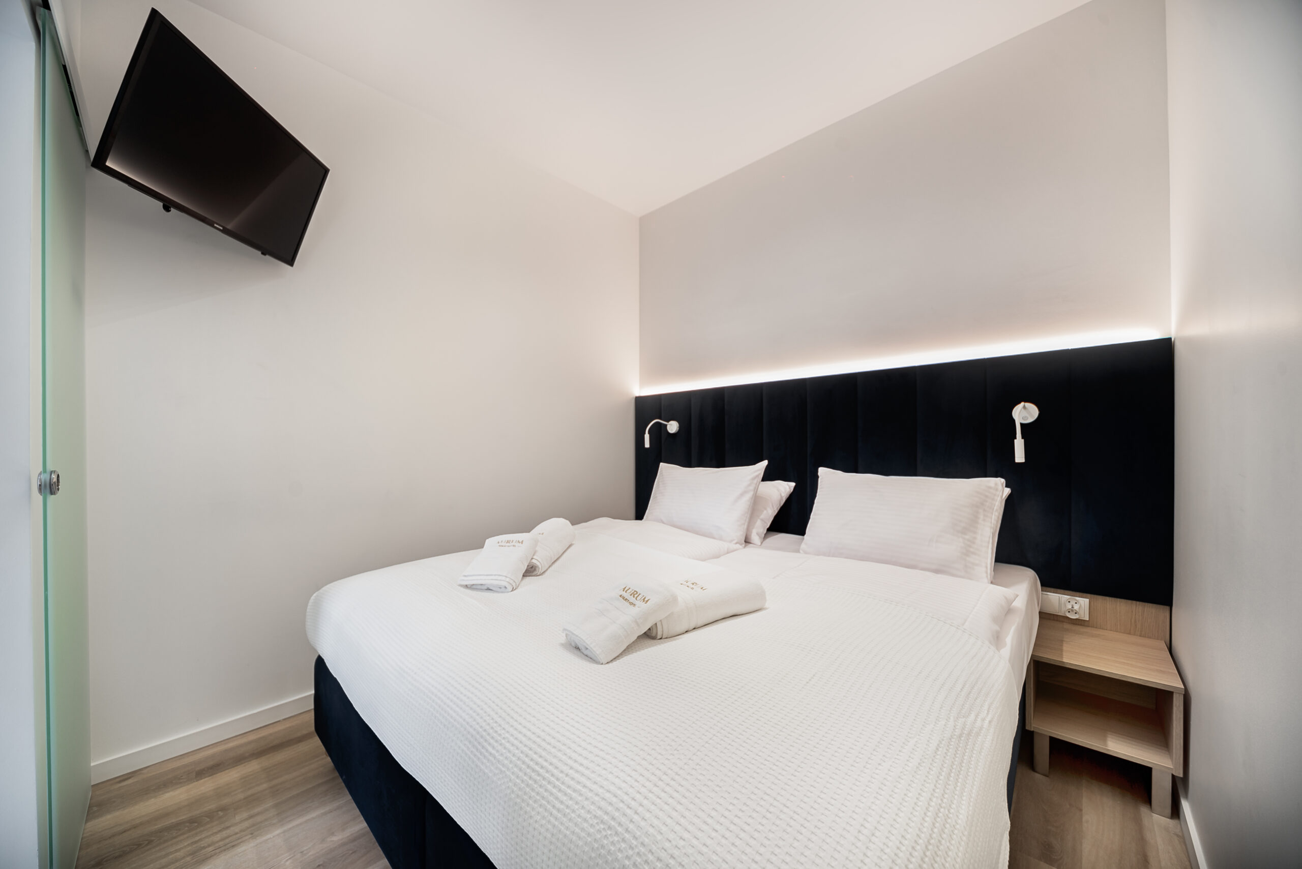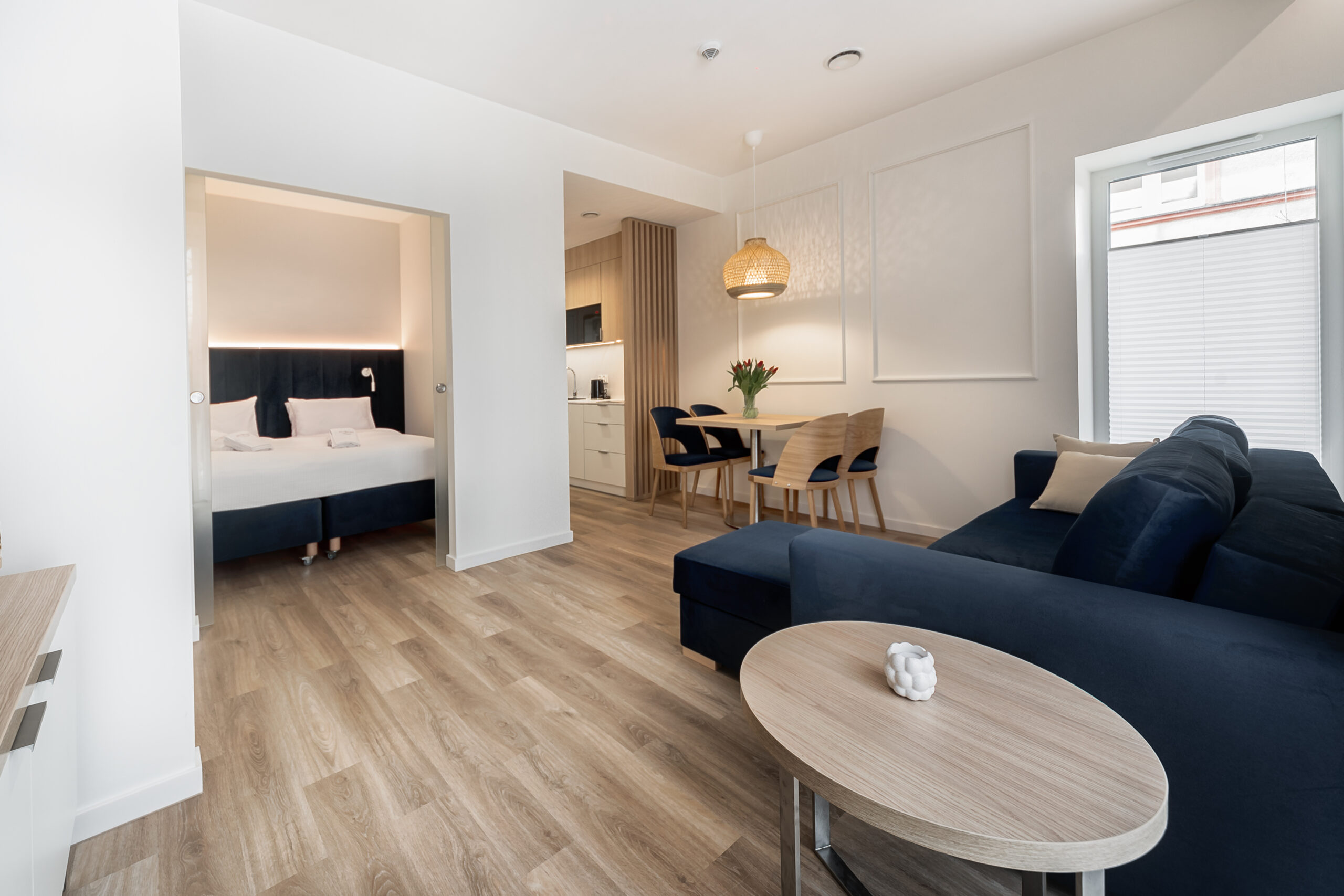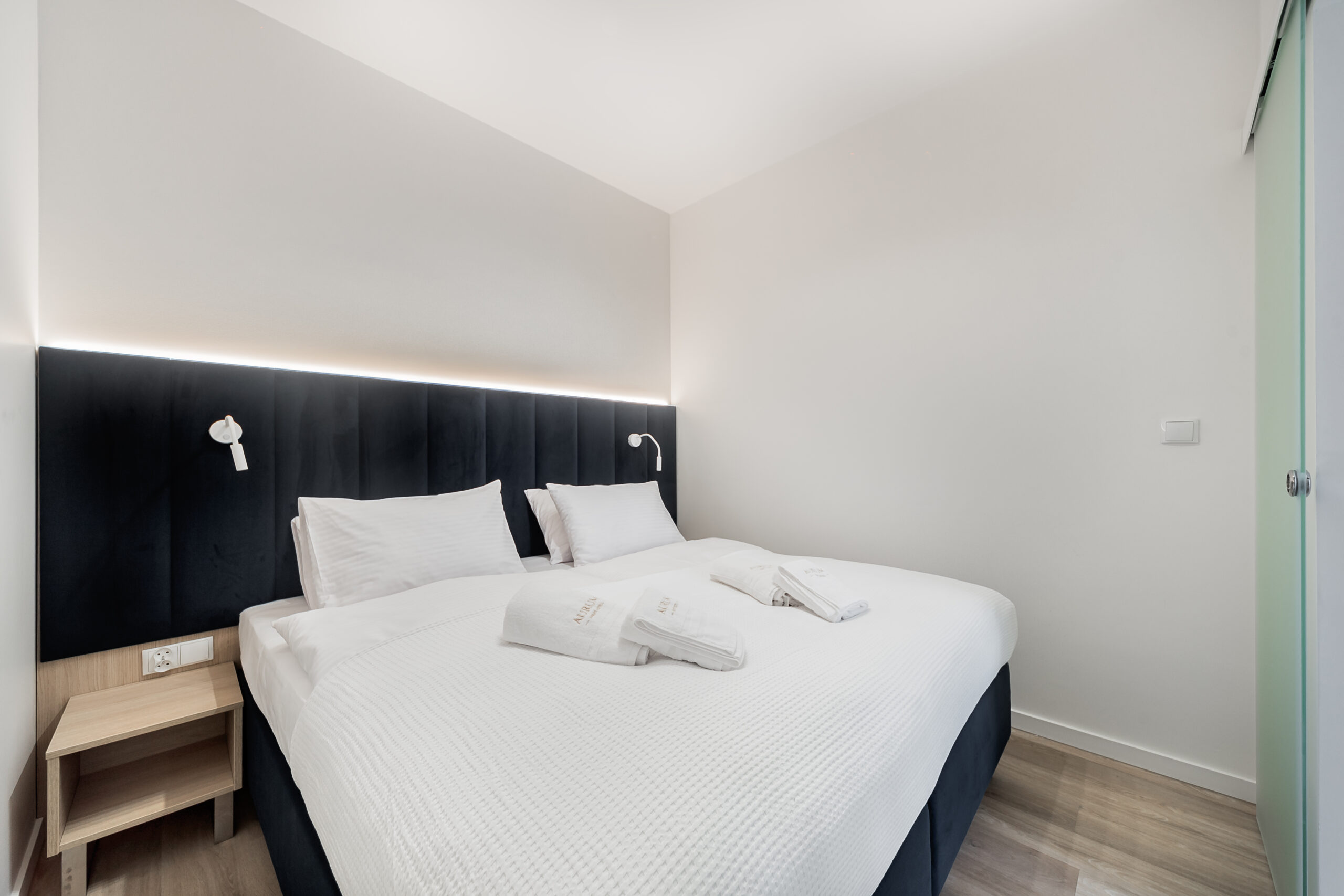 Apartament jednopokojowy z wyraźnie wydzieloną strefą nocną, zlokalizowany jest na pierwszym piętrze i posiada przestronny balkon o ekspozycji południowo-zachodniej.